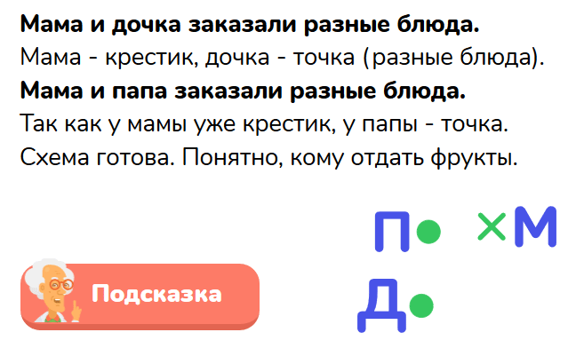 Мама и дочка, а также мама и папа заказали разные блюда. Как правильно распределить тарелки?